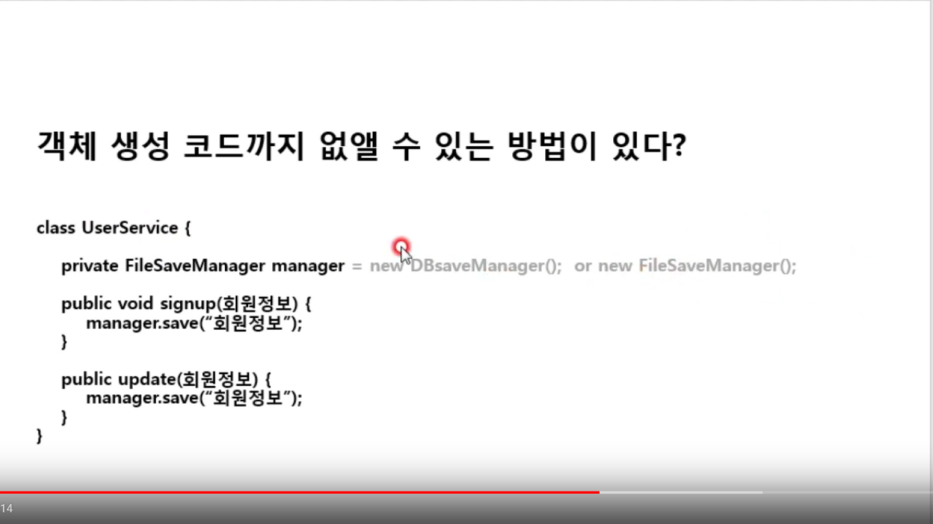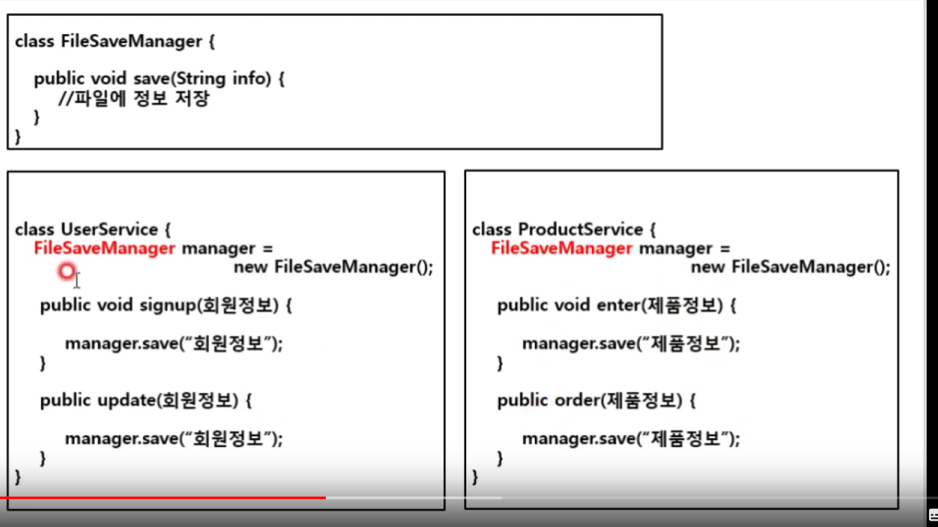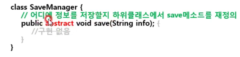 저장 공간이 바뀌면은 무슨 말이지? 아 파일이 아니라, 메모리에 저장하려고 하게되면 새로운 클래스 만들때, 세이브 메니저는 상속받고, 객체를 생성할때는 회색부분만 바꾸면 된다는 말이다.