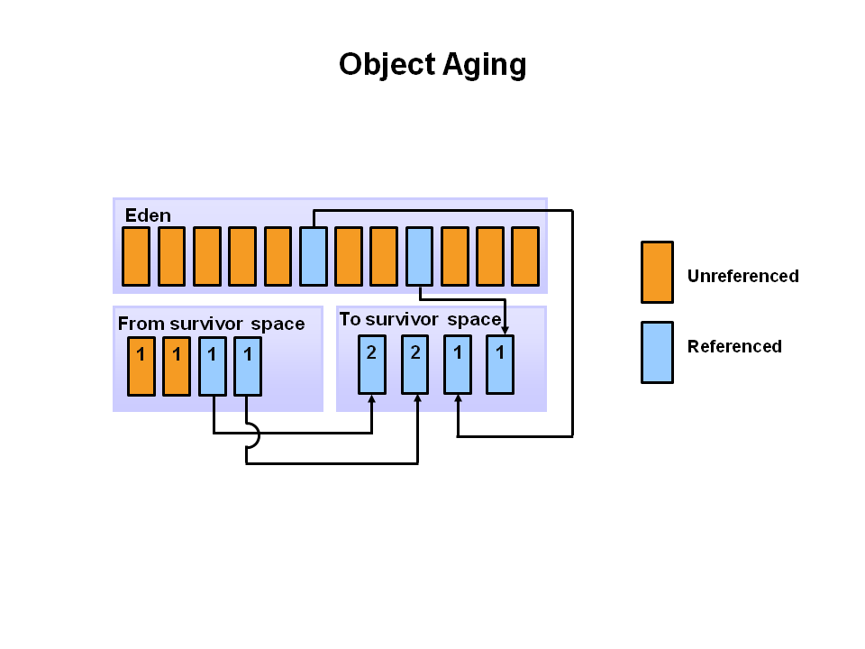 At the next minor GC, the same process repeats. However this time the survivor spaces switch. Referenced objects are moved to S0. Surviving objects are aged. Eden and S1 are cleared.