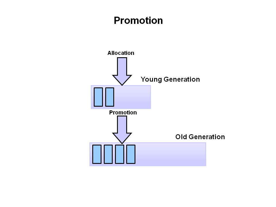 This slide demonstrates promotion. After a minor GC, when aged objects reach a certain age threshold (8 in this example) they are promoted from young generation to old generation.