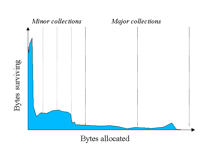 볼 수 있듯이, 더 적고 적은 사물들만이 시간에 따라 할당된다. 사실 대부분의 사물들은 아주 짧은 생존 시간을 갖는다.