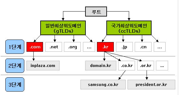 - 루트 도메인 바로 아래의 단계를 1단계 도메인 또는 최상위도메인(TLD, Top Level Doamin)이라고 부르며, 그 다음 단계를 2단계 도메인(SLD, Second Level Domailn)이라고 함