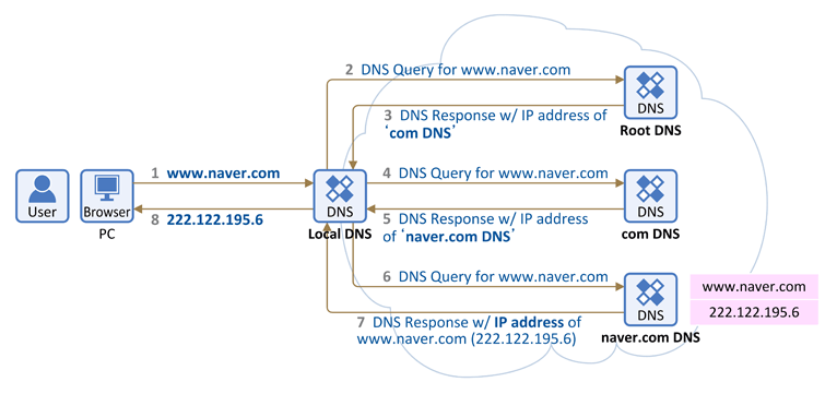Recursive Query : Local DNS 서버가 여러 DNS 서버를 차례대로 (Root DNS 서버 -> com DNS 서버 -> naver.com DNS 서버) 질의해서 답을 찾아가는 과정
