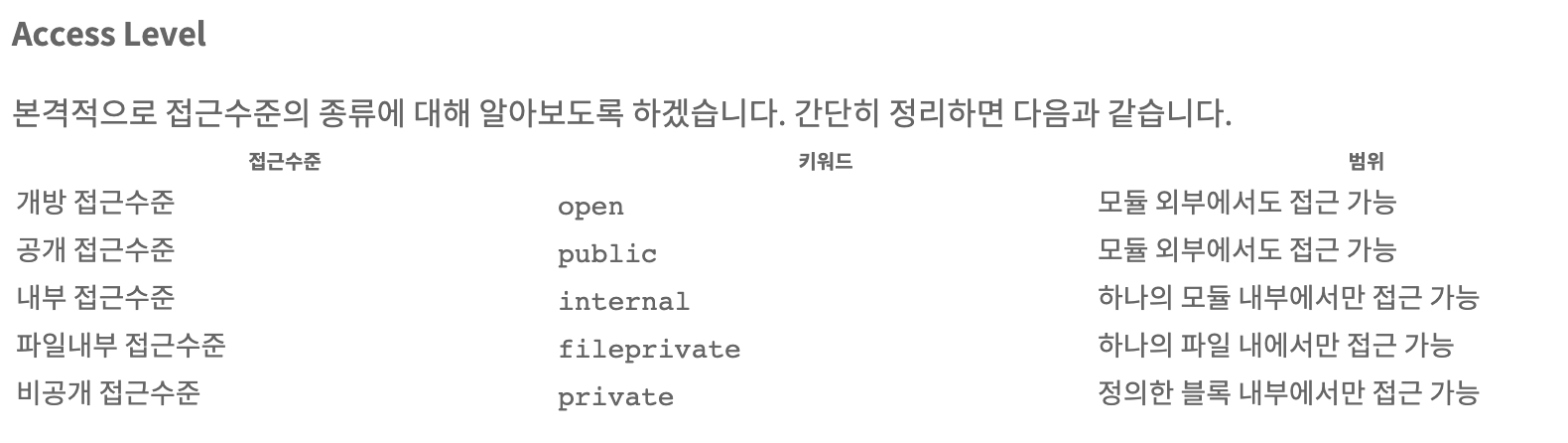 - 오픈, 퍼블릭 어세스는 해당 개체가 정의된 소스 파일이나 심지어 해당 개체를 임포트 하는 다른 외부 소스 파일에서도 해당 개체를 사용할 수 있도록 한다. 우리는 프레임워크에 퍼블릭 인터페이스를 특정할때 주로 오픈,퍼블릭 어세스를 사용한다. 둘의 차이는 공식 문서에서 자세히 설명되어있음.(난 나중에 볼듯..)
