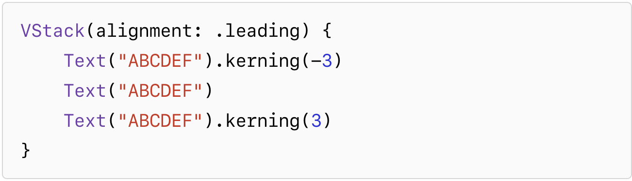 The effect of tracking resembles that of the kerning(_:) modifier, but adds or removes trailing whitespace, rather than changing character offsets. Also, using any nonzero amount of tracking disables nonessential ligatures, whereas kerning attempts to maintain ligatures.