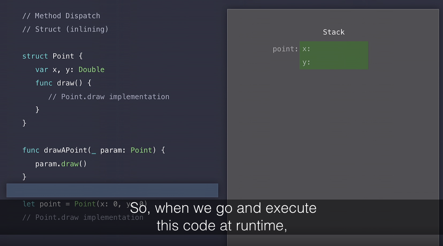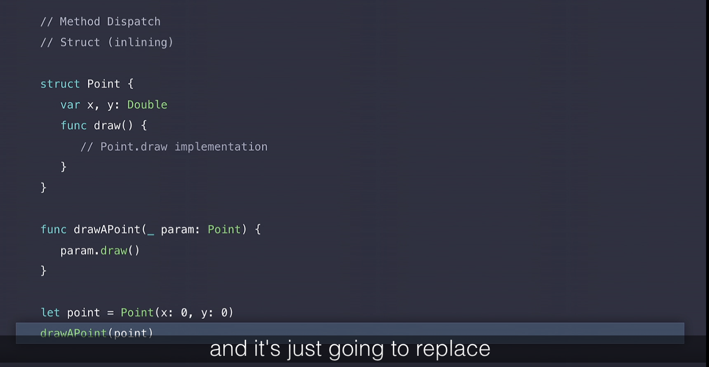 위 처럼 drawAPoint 메소드가 Point안의 struct의 draw 메소드인 경우, 호출 타이밍이 너무 명확한 경우 컴파일러는 static하게 디스패치 해버린다. 이 경우 drawPoint 호출시 이중으로 스택에 불필요하게 세팅되었을 오버헤드가 사라진다.