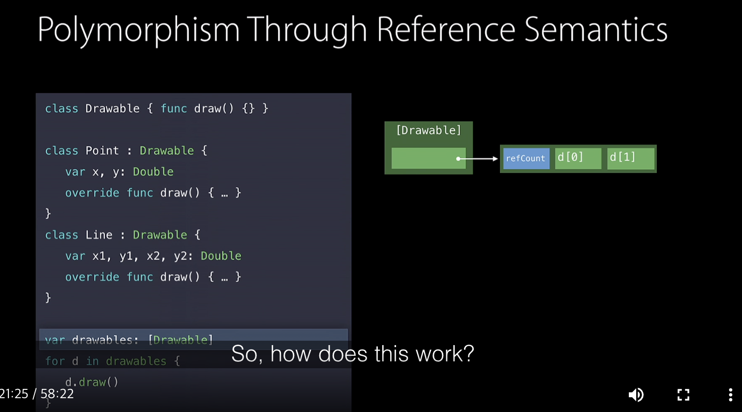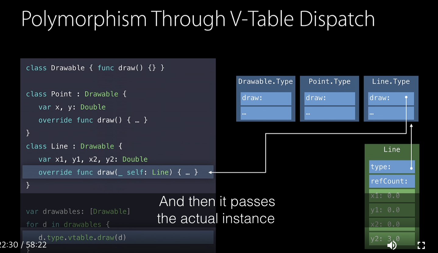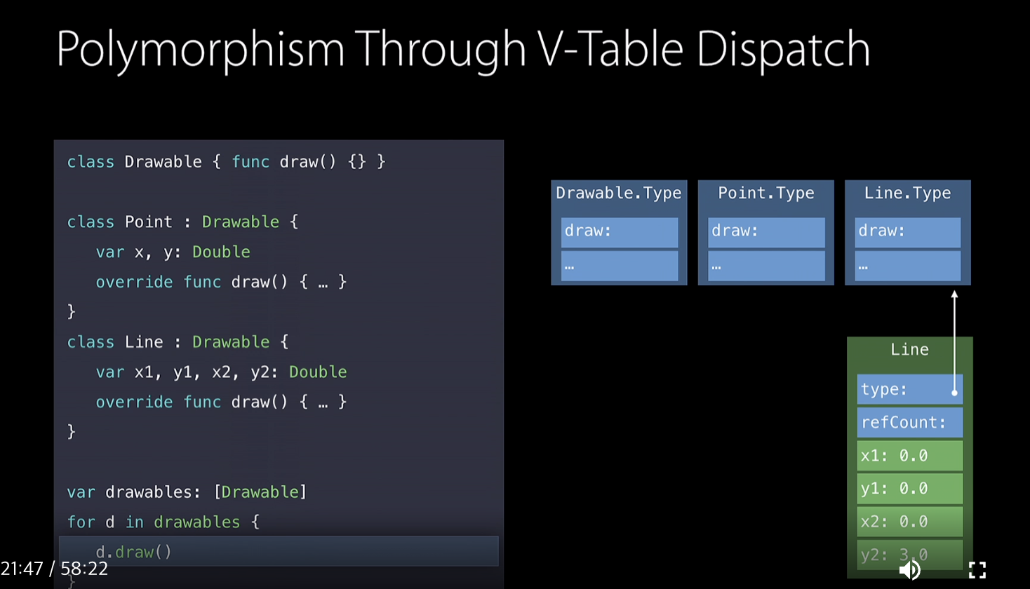 스위프트에서 다이나믹 메소드 디스패치가 사용되는 경우는 위처럼 다형성이 사용되는 경우일 수 있다. (다형성 객체의 메소드라고 무조건 다이나믹 디스패치는 아님; 호출 시점이 명확하면 컴파일러가 알아서 스태틱 디스패치로 하기도한다 함)