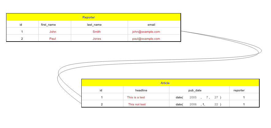 아래 예시를 보면 Article이 N개에 해당할때 Article안에 ForeignKey로 Reporter를 써준다. (개인적으로는 이 부분이 가장 햇갈렸다, ForeignKey를 어디에 써줄지, 결국 장고에서 테이블에 접근하는 코드를 구현한다고 생각하면, 떠오르기 더 쉽다.)